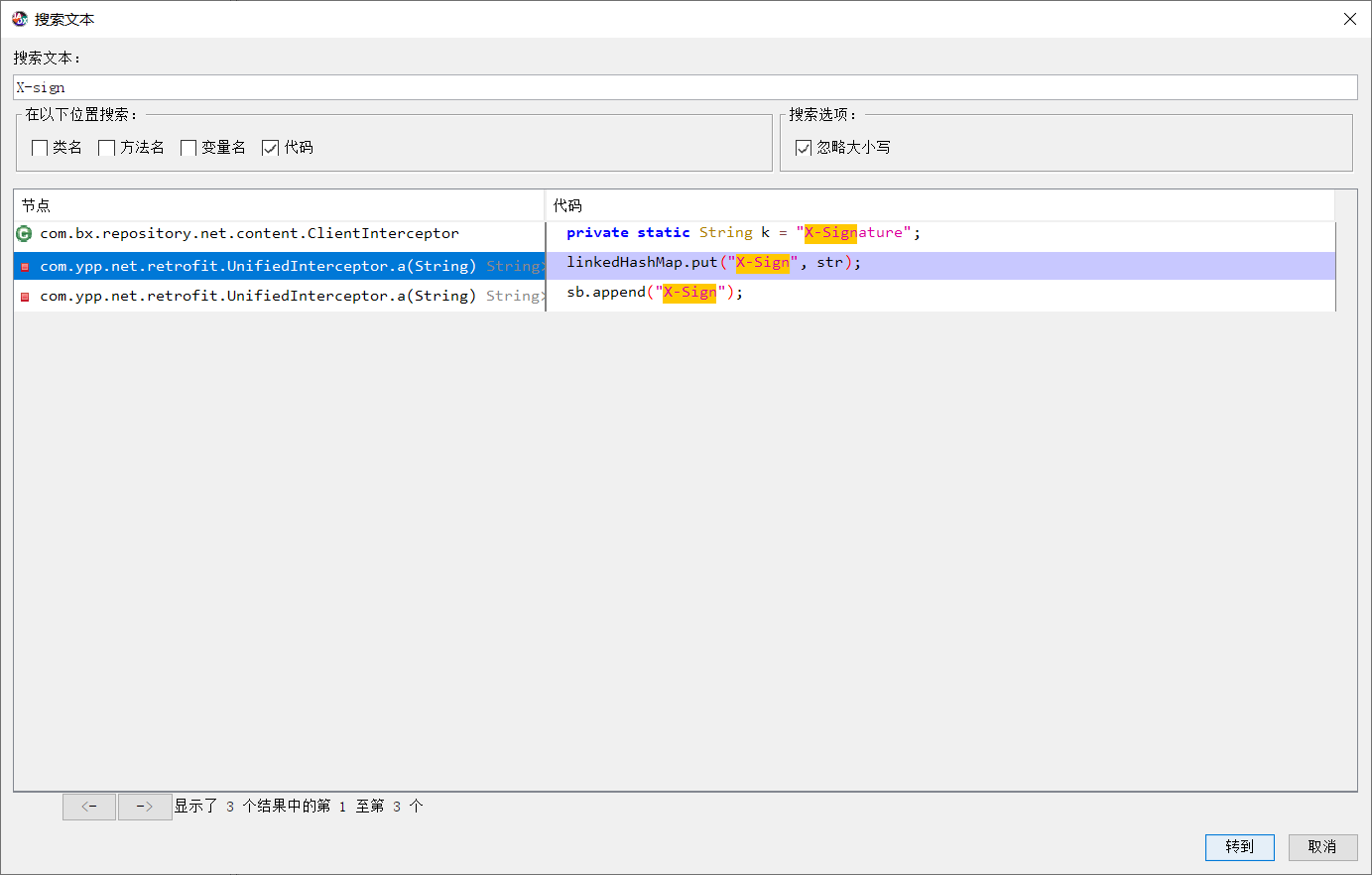 再次打开Jadx,直接搜索X-Sign,相关的条数很少,先点进第二条。