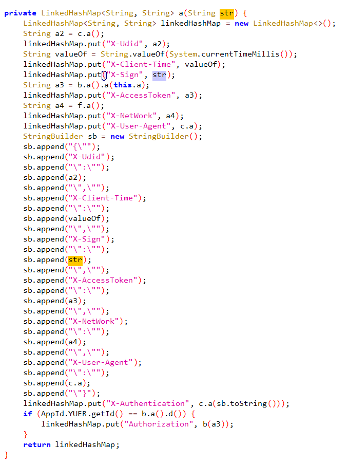 可以发现headers就是在这里生成的,X-Sign,X-Authentication都能找到。其实可以总结出linkedHashMap经常被用来拼装headers和请求参数。