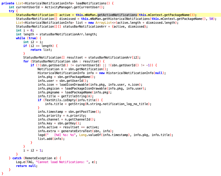 里边主要调用了getActiveNotifications和getHistoricalNotifications方法获取到了所有的通知,并解析出packagename、title等字段。